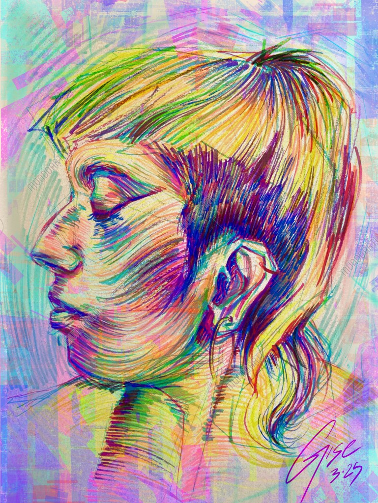 Autorretrato con un uso de la línea y del color expresivo. La pose serena contrasta con los trazos dispersos del fondo, pues se muestra la capacidad de encontrar la calma en una misma.