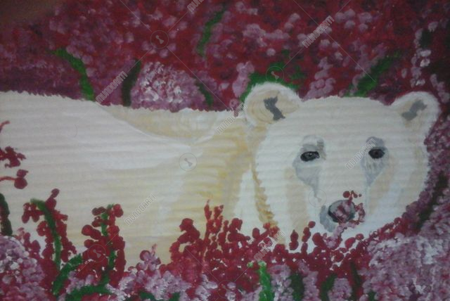 Es la imagen de un oso polar entre flores de alguna parte del artico que ha florecido en el breve verano.