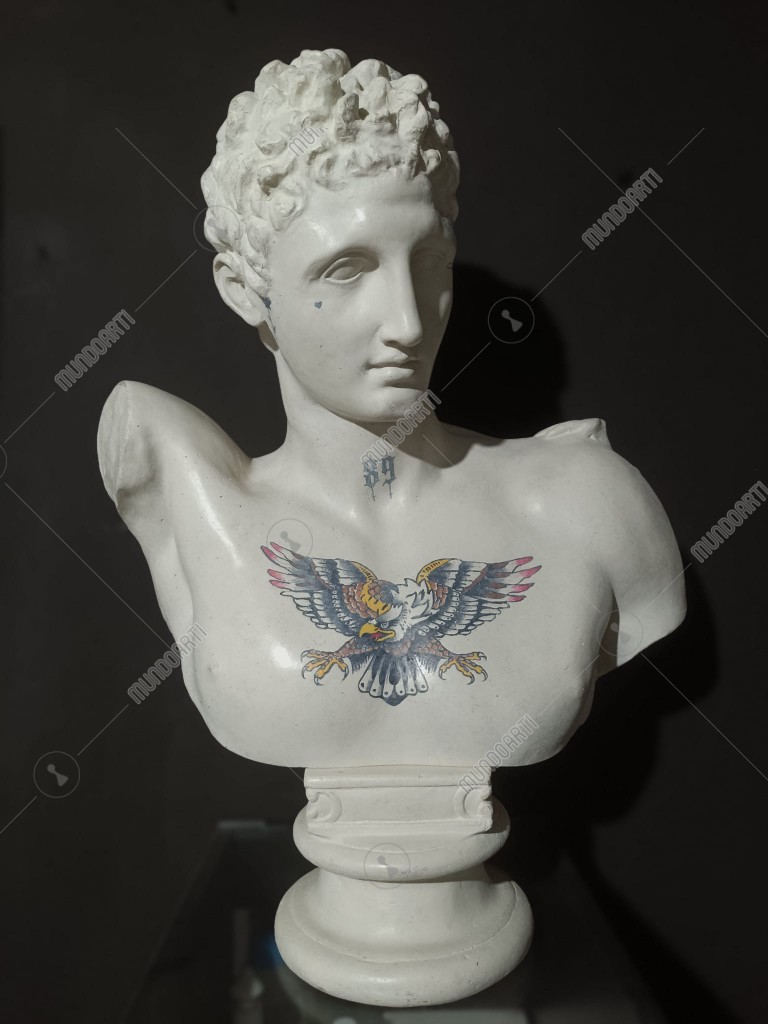 El trabajo se muestra como un busto de estilo clásico, elaborado con la apariencia del mármol, que reproduce la famosa representación de Hermes con el niño Dionisio del famoso escultor griego Praxíteles.