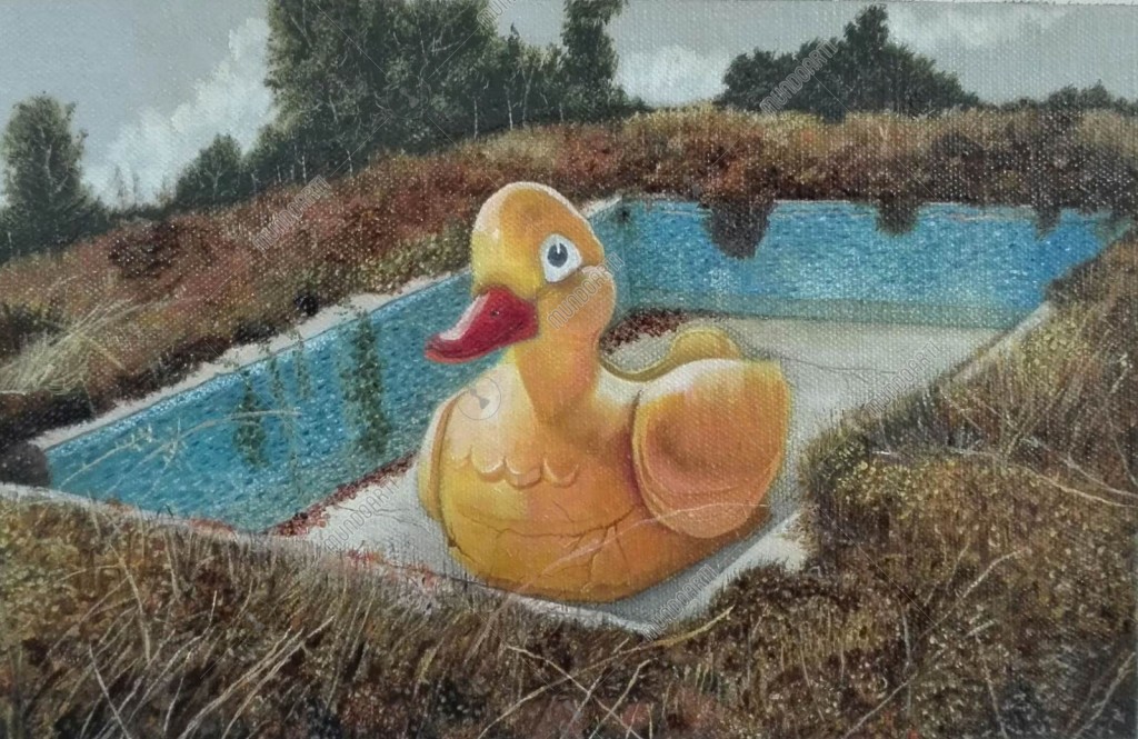 Pintura que reflexiona sobre el desgaste emocional en las parejas, pero que se aferran, aveces con torpeza e ingenuidad a seguir en union. Esta pieza realizada desde el formato del comic sketches es la última de esta serie en donde dos personajes (payasos) se interponen el uno al otro autosaboteandose en la lucha por rescatar su habitáculo (el pato salvavidas) que al final es abandonado ya inservible y desgastado por sus habitantes.