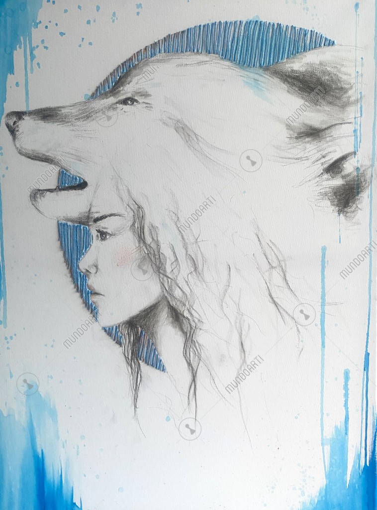 Retrato simbólico de la unión entre la artista y su perra. La superposición de los perfiles revela un vínculo íntimo y espiritual, donde lo humano y lo animal se funden en una sola identidad. El azul aporta profundidad y energía, mientras que el hilo bordado refuerza la idea de conexión y pertenencia.