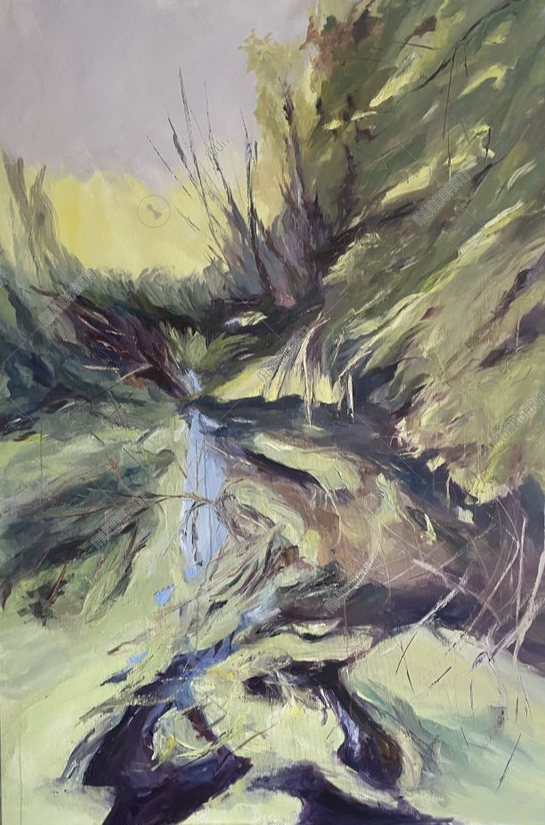 a obra representa una ciénaga, un espacio donde la naturaleza guarda secretos bajo su aparente quietud. Más que un paisaje, es una mirada hacia lo que no se ve: la vida que late en silencio dentro de la ciénaga.