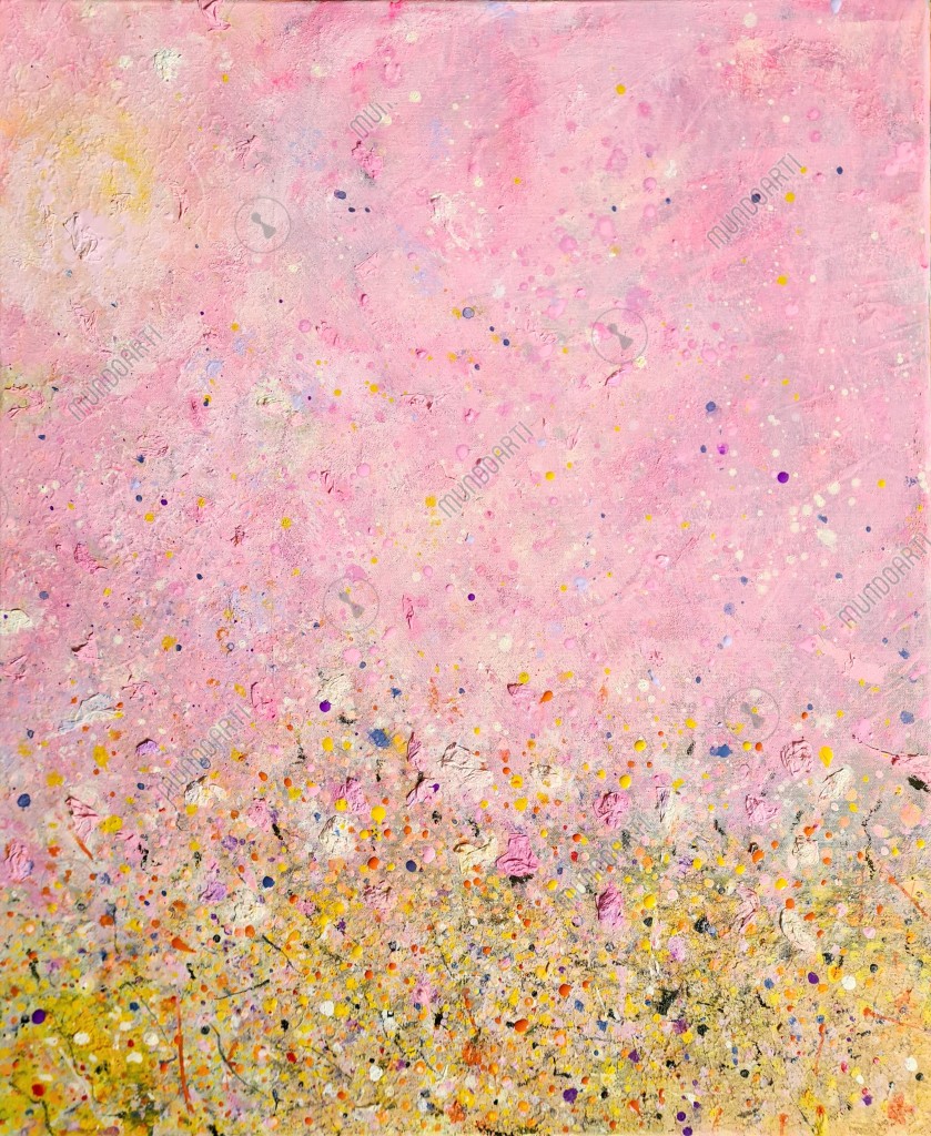 Reverie XV es una obra abstracta que invita a soñar despierto. Los tonos suaves de rosa se funden con destellos de amarillo, blanco y violeta, creando un paisaje etéreo lleno de energía y calma a la vez. A través de capas aplicadas con esponja y un delicado trabajo de punteado, la superficie adquiere profundidad, movimiento y una sensación de ligereza casi mágica.