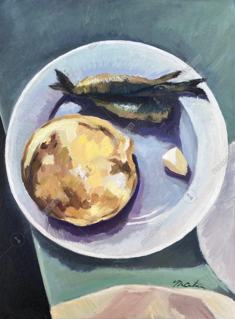 Un bodegón sencillo y sincero, una tostada con sardinas convertida en icono de mi tierra y de mi memoria. Esta obra nace del deseo de rendir homenaje a la pureza del bodegón clásico español, pero trayéndolo al presente, con un guiño andaluz. No es solo una combinación gastronómica, es un "Andalusian Crush". Un homenaje íntimo de lo cotidiano elevado a lo universal, donde lo humilde se vuelve arte.