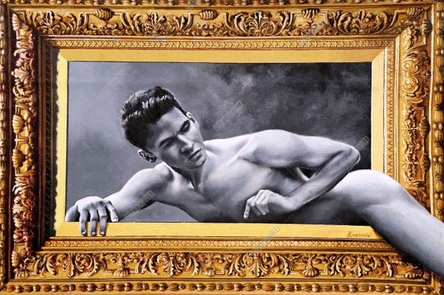 Juego visual de un modelo fotográfico en blanco y negro que intenta escaparse del marco que lo recuadra.