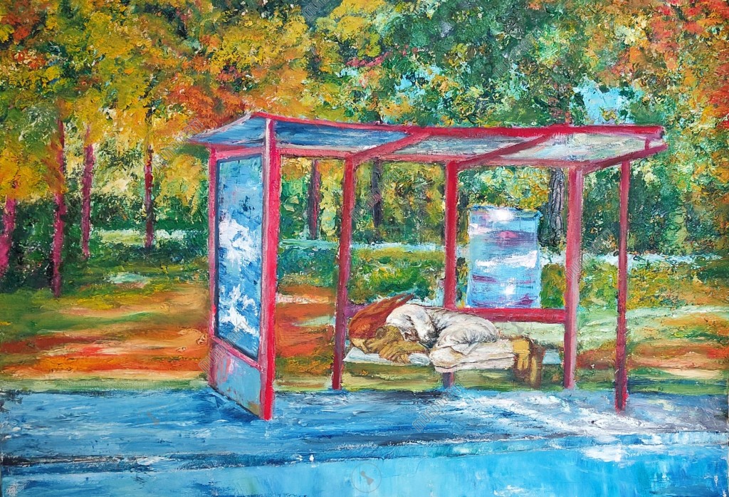 En una parada de bus, aprovechando el asiento para descansar un poco