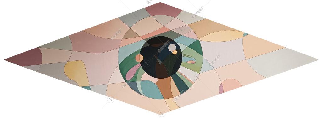 Una obra de gran formato en forma de rombo, concebida como un portal hacia la introspección. En mis meditaciones, este ojo se presenta con frecuencia: una mirada que viene de fuera pero que, al mismo tiempo, surge desde dentro. La composición centra la atención en un iris multicolor, rodeado de formas y líneas geométricas en tonos suaves que refuerzan la sensación de armonía y expansión.