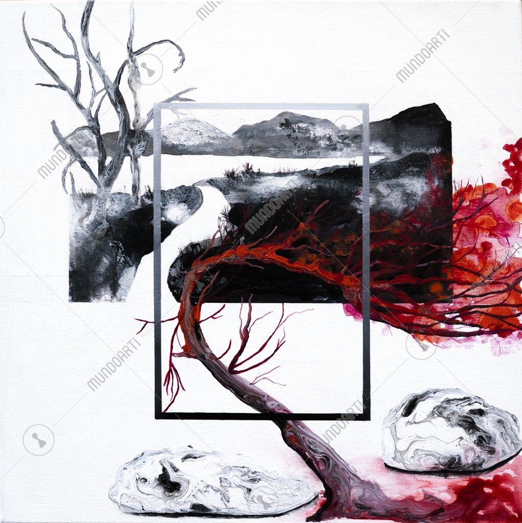 Paisaje entre la figuración y la abstracción en donde destaco la iconografía del paisaje , el simbolismo que representan las diferentes partes de la obra y como estas confluyen para ser interpretadas como parte de mi experiencia personal .