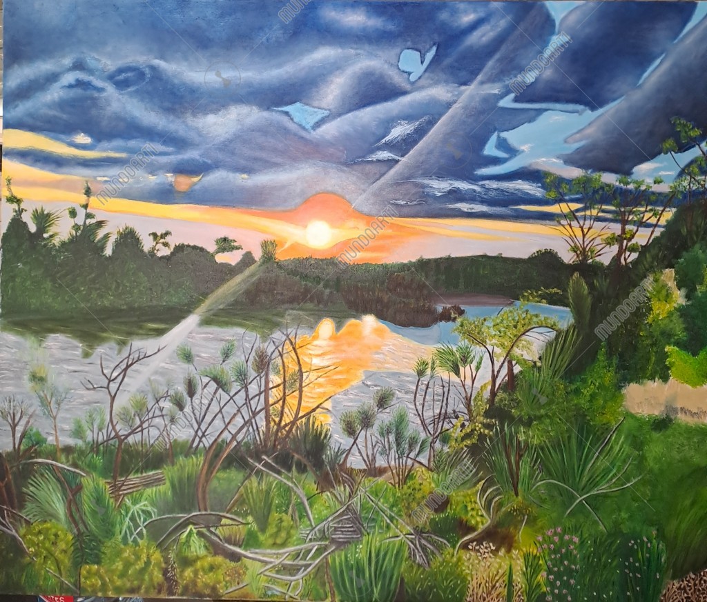 Atardecer sobre el Rio Ebro en Pastriz, se puede observar su variada vegetación en primer plano, en segyndo plano el agua con el reflejo del sol, en tercer plano al fondo para dar profundidad en la otra orilla mas vegetación y un rayo de luz que cruza desde el sol hasta el agua. En el cielo el sol ya cayendo y lel cielo repleto de nubes abruptas