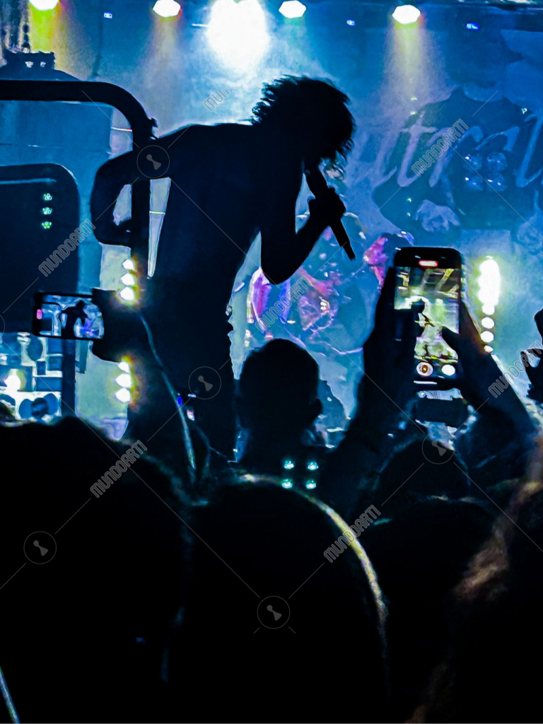Imagen tomada en concierto, que evoca claramente un ambiente festivo y jovial. Dinámica. Con una mancha de color muy equilibrada. Rompiendo con las siluetas de los artistas.