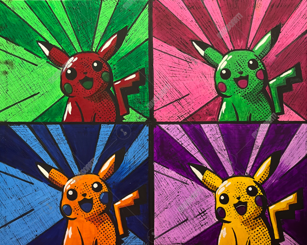 Un conjunto de cuatro dibujos de Pikatchu estilo pop Art, jugando con colores fuertes y fondos en formas de rayos. Es la misma figura, pero cada una expresa una energía diferente según el color. Es una pieza divertida, llamativa y con mucha fuerza visual.