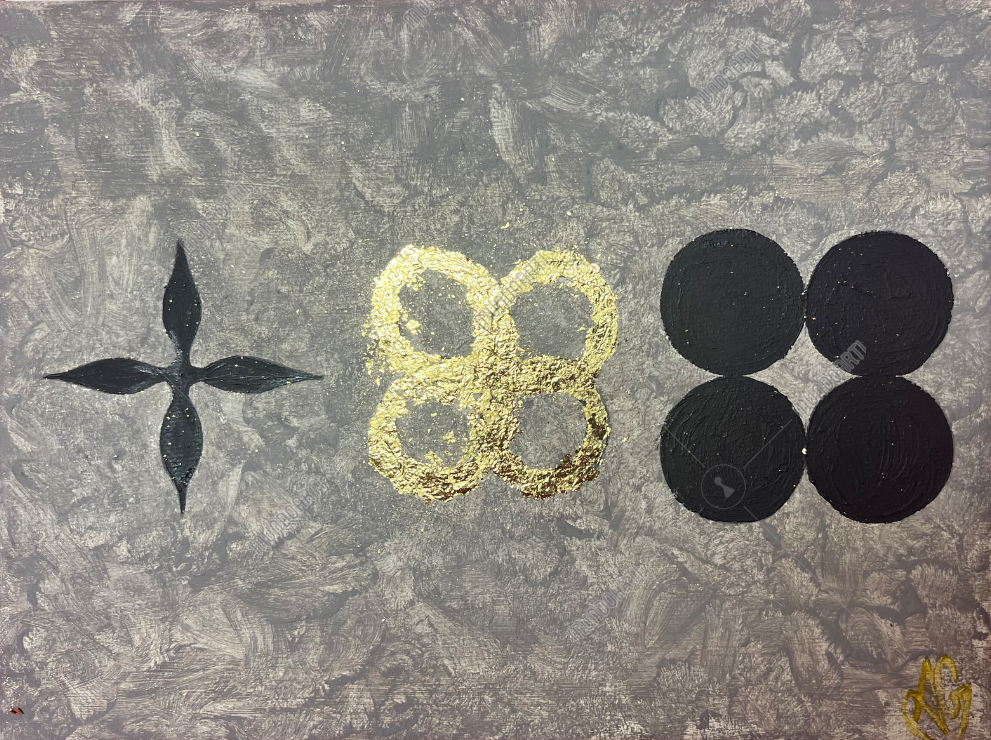 Este cuadro representa el álbum WINGS de BTS. El fondo gris refleja el conflicto interno de la juventud. Con símbolos, muestra la transición: la inocencia inicial, la tentación y el despliegue de las alas doradas, hasta la madurez. Captura el viaje de los jóvenes hacia la adultez.