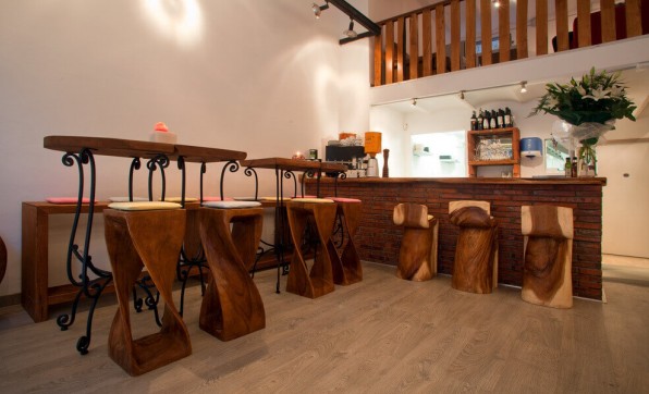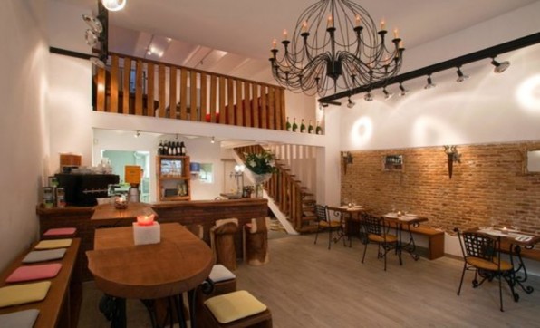El mobiliario de madera, sus paredes rústicas, la luz de las velas, su majestuoso candelabro y sus plantas, aportan al restaurante Pau Claris 190 una especial y animada atmósfera.