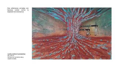 Dos enfermeras armadas con bazocas luchan contra la explosión de coronavirus Lucha contra el coronavirus 60 x 40 cm Acrílico con cemento cola y estaño fundido.