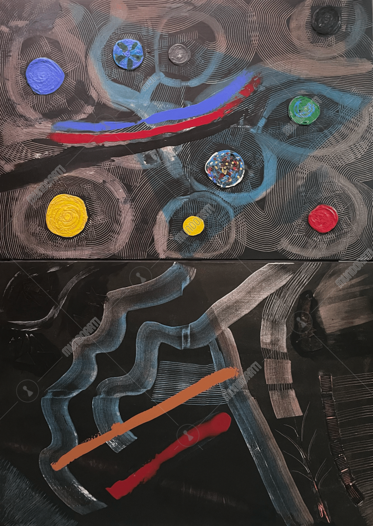 Los Planetas es una composición que explora la armonía y el caos del universo interior. A través de una estructura circular y líneas concéntricas, la obra evoca la danza cósmica de los cuerpos celestes, donde cada color representa una energía vital. Los tonos vibrantes contrastan con el fondo oscuro, simbolizando el equilibrio entre expansión y silencio. Esta pieza invita al espectador a contemplar la conexión entre el orden universal y la energía creativa que habita en cada ser.