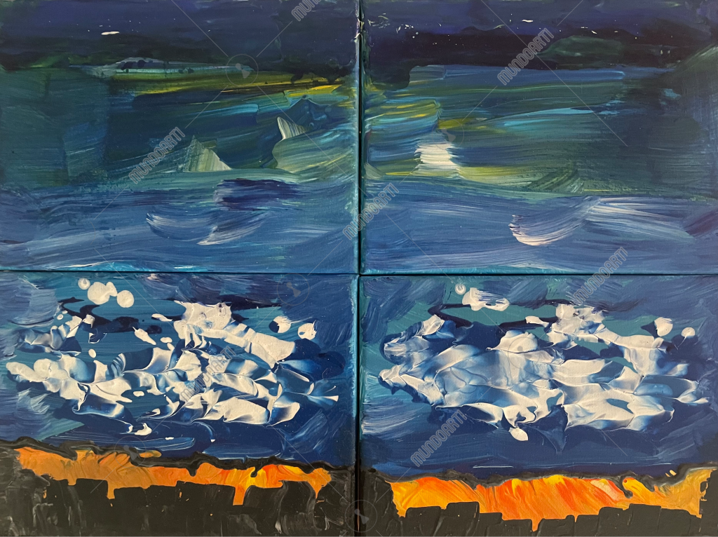 Cuarteto acrílico sobre lienzo, 4 × (18 × 24 cm) Cuatro ventanas al mismo latido. Arriba, la noche se derrama en azules profundos, nubes de sal y espuma se retuercen en silencio. Abajo, el fuego se arrastra por la orilla: naranja fundido, negro de carbón, un río de lava que besa el mar. Entre ambos, la desembocadura: agua y ceniza, cielo y magma, un abrazo que quema y apaga.