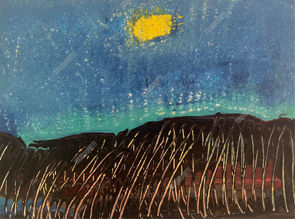 Acrílico sobre lienzo, 30 × 40 cm Un sol de oro líquido estalla en el cenit, salpicando chispas sobre un cielo de cobalto helado. Debajo, la tierra se quiebra en costras negras, surcada por ríos de obsidiana y vetas de carmín ardiente. El horizonte exhala turquesa, como un último aliento antes de la noche. Textura densa, gesto visceral: la pintura gotea, se arruga, se funde. Un paisaje que late entre la creación y la ceniza.