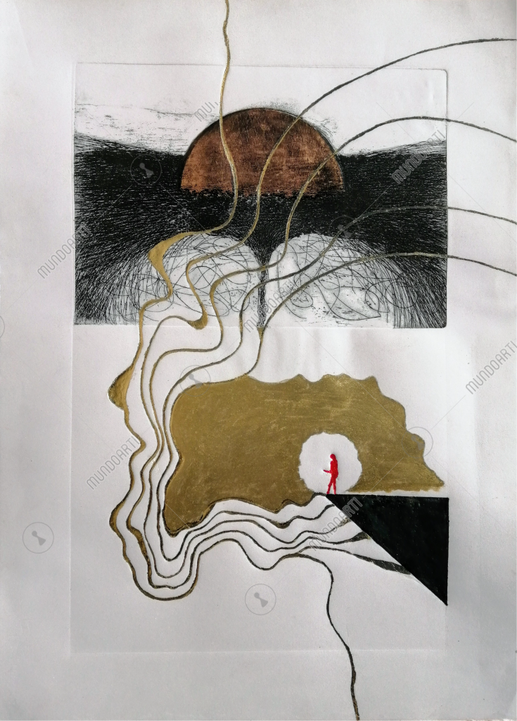 Acquaforte - Acquatinta - Punta secca e tecnica sperimentale di incisione su con polvere d'oro e carta Pescia