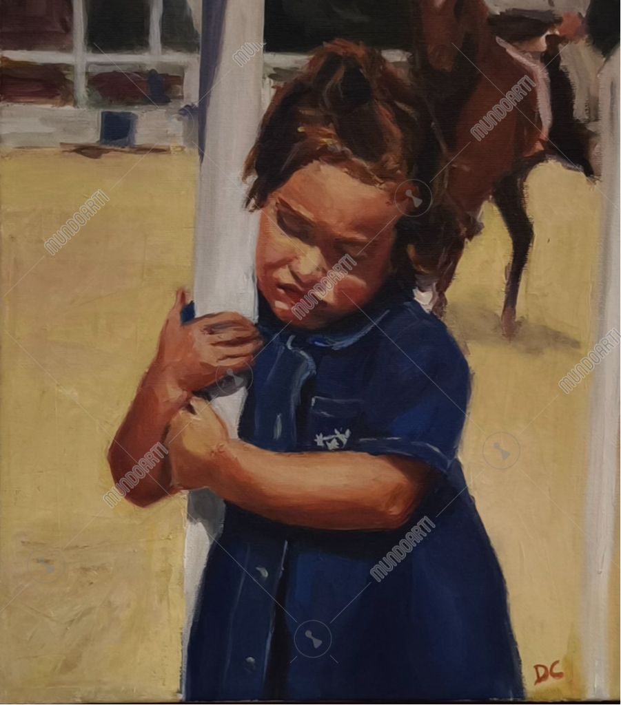 Esta pintura profundiza en la conexión entre el alma humana y el espíritu animal. 'Terapia equina' representa un lugar de entendimiento mutuo donde no se requieren palabras. A través del juego de luz y sombra, intento capturar la 'mirada interior' en su estado más sereno, sostenida por la fuerza y calma del caballo. Esta pieza manifiesta el poder terapéutico de la presencia animal que permite a un espíritu frágil encontrar equilibrio.