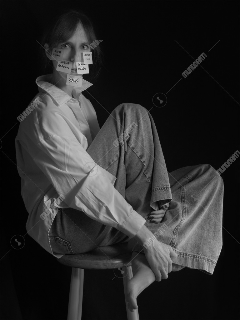 En Roles, la presión no se muestra como una tarea, sino como una transformación: la propia esencia se va diluyendo a fuerza de responder a lo que se espera de nosotras. Las etiquetas ocupan el lugar de la persona y la voz queda tapada por exigencias (“buena madre”, “buena esposa”, “buena hija”…). La imagen habla de esa pérdida gradual de identidad: cuando el “deber ser” gana terreno y lo que una es —lo que desea, lo que necesita— se pospone, se borra o queda reducido a un resto.