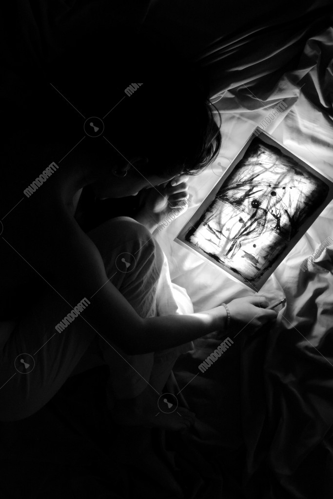 Una mujer yace tumbada en la oscuridad, casi fundida con las sombras. Solo sus facciones quedan parcialmente iluminadas por un dibujo a tinta que se proyecta sobre su rostro y su cuerpo. La ilustración, de trazos intensos y formas inquietantes, representa una escena tétrica que evoca la ansiedad, el estrés y la sensación de pesadilla. La luz del dibujo contrasta con el entorno sombrío, como si los pensamientos oscuros cobraran forma visible sobre ella. “Despierta”, sugiere la tensión entre el sueño y la vigilia, entre la necesidad de descansar y la imposibilidad de escapar de aquello que la atormenta.